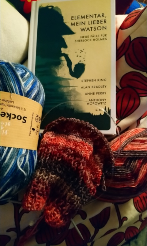 Ich habe mich mal wieder abends an das Socken Stricken gewagt. Auch motiviert durch Bloggerinnen und weil ich gerne Wollsocken im Winter trage. Nun versuche ich es erstmals mit der Rundstricknadel, denn das Bündchen mit dem Nadelspiel ist immer furchtbar für mich. Ich bin im Urlaub gar nicht so viel zum Lesen gekommen, wie ich mir das gewünscht habe, aber man kann nicht alles haben. Über Urlaub, Bücher und den Monatsvogel berichte ich noch. Was am Sofa liegt, sehr Ihr hier. Neben dem Bett stapelt sich auch einiges und auf dem Reader ist der nächste englische Titel angefangen worden.