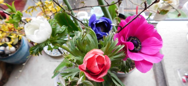Nun darf ich Euch noch meine Blumen zeigen. Forsythienzweige, spät wachsende Rittersterne, (ja, sie haben es schon so weit geschafft,) einen kleinen Strauss Windröschen/Anemonen. Ein paar Knollen dieser Frühling – Windröschens weichen gerade ein, denn man kann sie auch jetzt einsetzen, vorausgesetzt man pflanzt bei frostfreiem Wetter. Ich mag diese wunderbar bunten Blumen im Frühjahr ganz besonders!