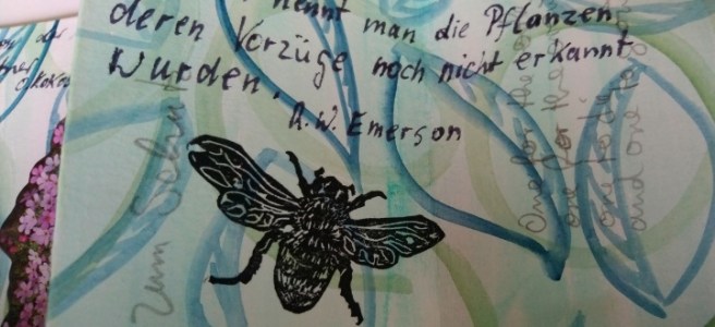 Jetzt habe ich Euch mit all den Widrigkeiten traktiert, dabei hatte ich mindestens so viele schöne Kreativmomente. Als mir das mit den Pusteblume eingefallen ist zB. oder als es mit dem Falten irgendwann einfach so geklappt hat, die gepressten Blumen in den Gedankengarten kamen, die Gartenbesucher sich so gut einfügen, denn was ist ein Garten schon ohne Insekten und Vögel.