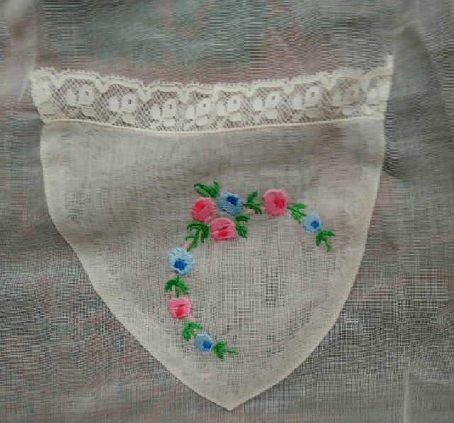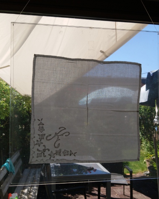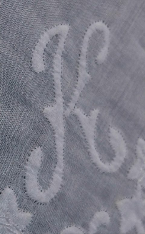 Dieses Taschentuch ist aus Mousselin (Musselin), in diesem Fall sogar Seidenmousselin. Die Handarbeitskünstlerin hat die hervorzuhebenden Stücke ausgeschnitten, die Kanten umgelegt und mit fast nicht sichtbaren Stichen angestickt. Das wirkt, als wäre es ein Stoff, nicht aufgesetzt. Kenner von Stickereien fühlen sich vielleicht an Schattenstickerei erinnert, diese wird aber mit einem Faden auf der Stoffrückseite gemacht.
