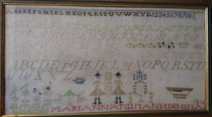 Gabi hat Euch ja schon das Sticktuch ihrer Oma gezeigt. Bei mir in einer dunklen Ecke neben dem Bett hängt dieses Tuch von meiner Ururoma.