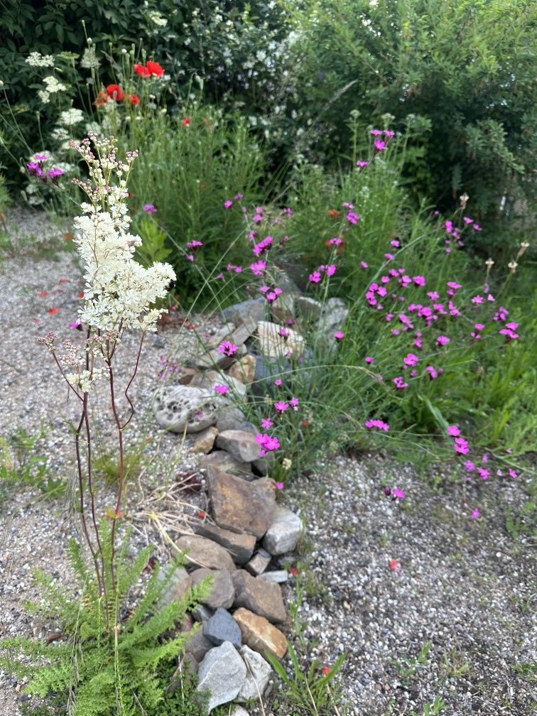 Dann kommt ein Bereich, wo ein kurzer und magerer Rasen wachsen soll. Darunter kommt der Teil, der all den vielen Blumen, die keinen nährstoffreichen Boden brauchen, überlassen ist. Mit Kies wurde der Boden angereichert um ihn magerer und auch lockerer zu machen. All der Stickstoff und die reichlichen Gaben, die unsere bearbeiteten Böden haben, mögen viele Blumen gar nicht. Hungerkünstler sind einige von ihnen. So steht zB das kleine Mädesüß gerne trocken. Seine große, bekanntere Schwester dagegen gerne an Bachläufen.