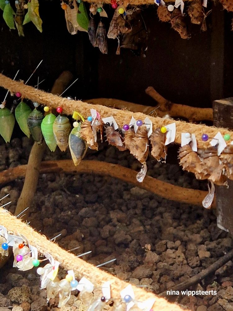 Gleich am Eingang des tropischen Gartenhaus für die exotischen Schmetterlinge sind all die eingesammelten Puppen in denen gerade die Metamorphose von Raupe zum Schmetterling statt findet.