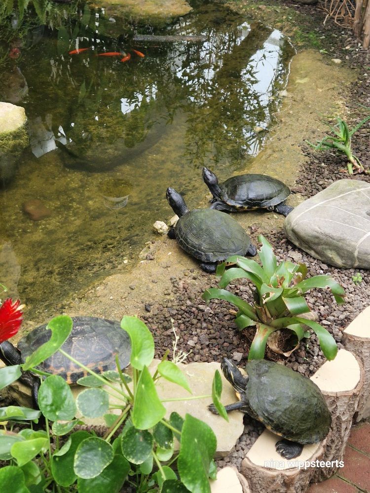 Damit die Luftfeuchtigkeit gewährleistet ist, gibt es einen Wasserfall mit Bachlauf und Teich.