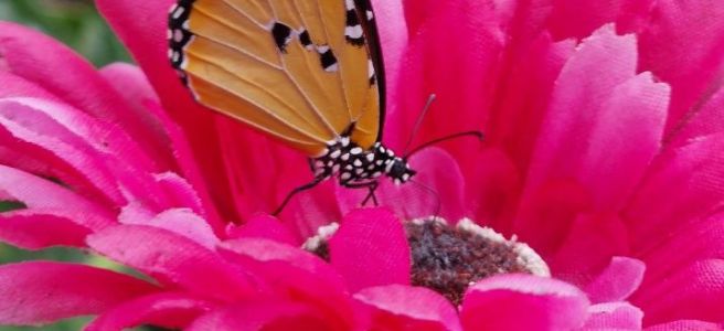 Jeder von uns hatte eine kleine Plastikblume, die mit Fruchtnektar getränkt war, zum Anlocken der Schmetterlinge.