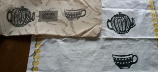 Mutig rollte ich nun mit der Farbwalze über den kleinen Stempel des Segelschiffs und drückte es erstmal ganz an die Seite, falls ich verrutschen sollte oder es nicht gut annehmen würde, bei dem nun mal anderen Material als Papier. Dann kam eine ganze Flotte hinzu, sollte das auch mit feineren Konturen gehen? Es geht sogar sehr gut! Die Linolfarbe ist da wirklich klasse! Ich bin total begeistert. Die Farbe braucht nur einige Zeit zum Trocknen. Daher ist nur eine Seite und was ich vorsichtig umlegen konnte, bedruckt worden, bzw. dann war die Farbe wirklich alle!