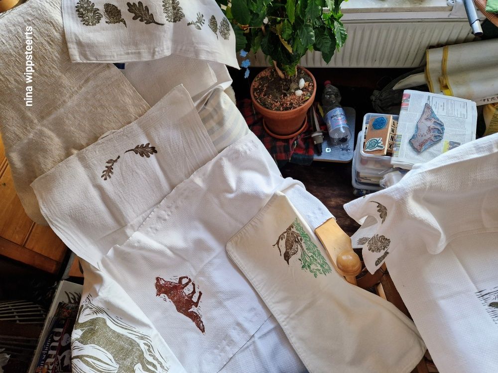 Dieses Mal habe ich Leinen Trockentücher richtig mit Linolfarbe bedruckt. Einige gingen per Post gen Norden. (Bingo Weihnachtsfreuden „The Gift“)