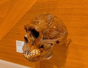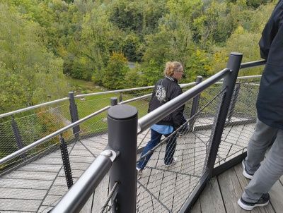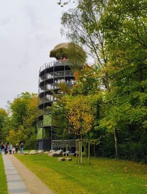 Und kommt zum Fundort und Aussichtsturm. Oben drauf thront die nachgemachte Schädeldecke, welche man hier gefunden hat, so als schaue der Neanderthaler ins Land.