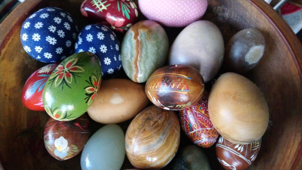 So langsam hole ich auch mal die Osterdekoration aus dem Keller. Diese wunderschöne Schale ist ein Erbstück von meiner Grosstante. Ein gedrechseltes Meisterwerk, vor allen Dingen, die Holzmalereien. Da ist es zu schade, alle meine Schätze (Textil, Holz pur und bemalt, Stein) rein zu füllen. (Ja, ich bin dieses Jahr etwas spät dran.)
