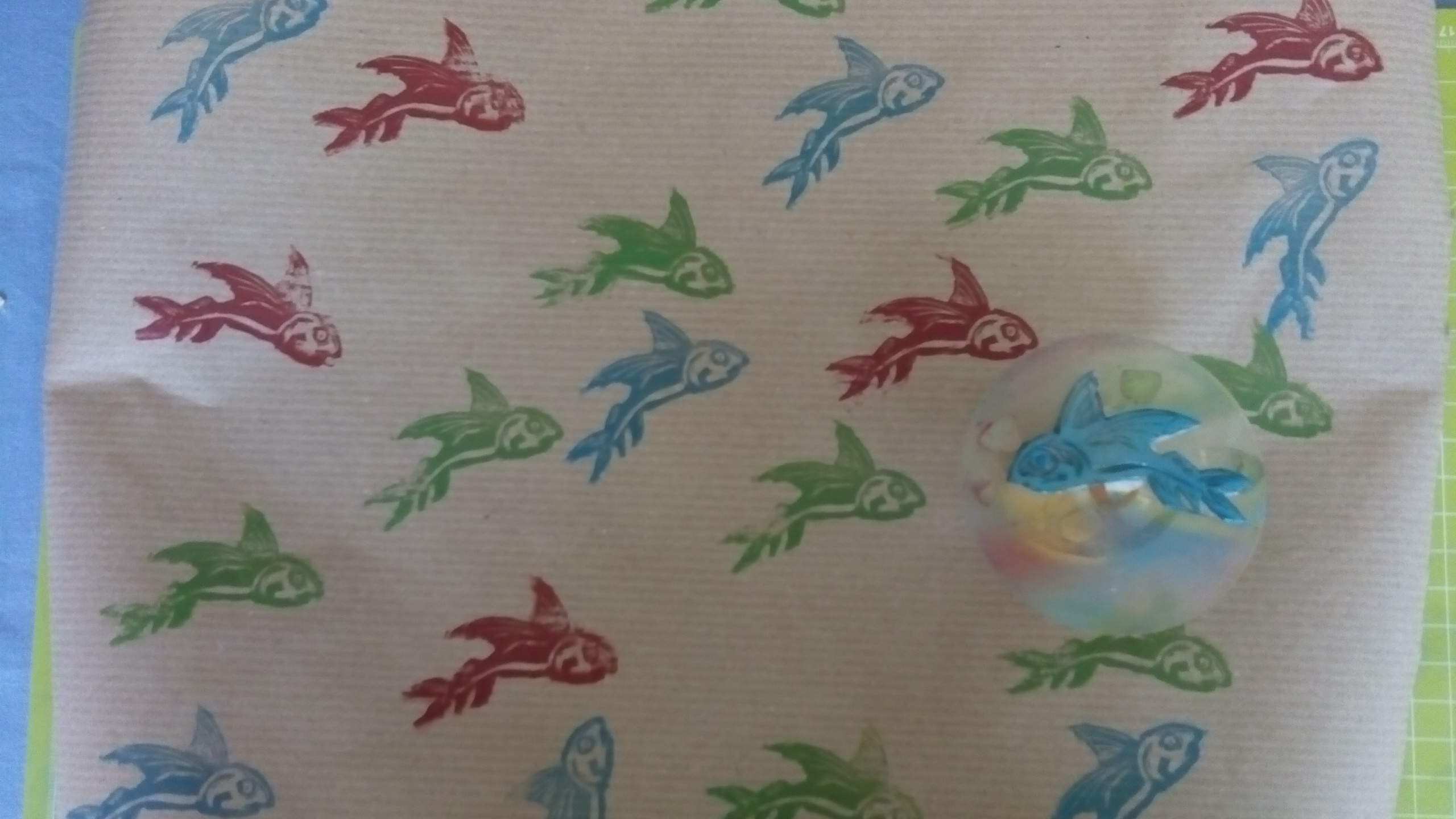 Damit der eine Stempel in zwei Farben gedruckt werden konnte, habe ich ihn mit dem Cutter getrennt.
