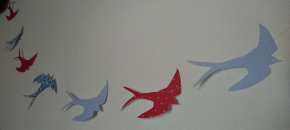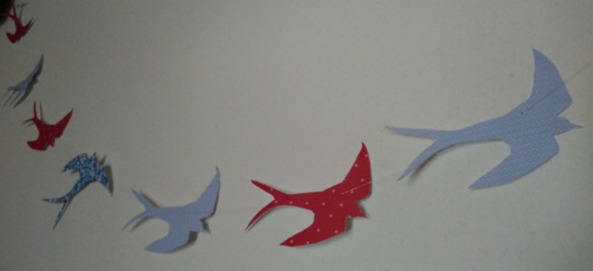 Beim kreativen Part muss ich diesmal um etwas Geduld bitten, denn statt den geplanten Stempeln, gibt es bis jetzt nur diese Skizze. Wer mag, kann sich aber das PDF der Girlandenvorlage runterladen um ein paar Schwalben fliegen zu lassen, sie als Schablone zu nutzen, um aus buntem Papier Schwalben auszuschneiden. Ihr könnt sie auf einen Faden als Girlande ziehen oder an die Fenster kleben.