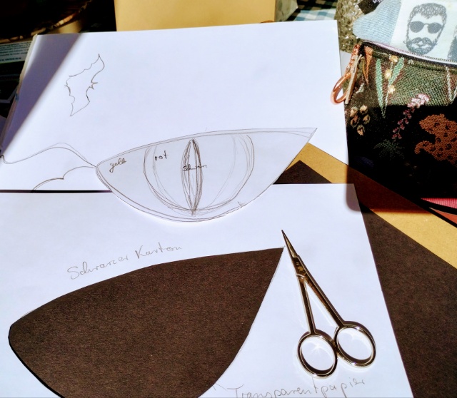 Für den gruseligen Einblick braucht ihr Transparentpapier und schwarzen Tonkarton. Malt oder druckt Euch ein „Auge“ erst auf Papier, schneidet die Augen Umrisse und eine Iris aus. Aus der schwarzen Pappe trennt Ihr den Umriß aus, nachdem Ihr mit einer Schablone vorgezeichnet habt. Dann klebt Ihr das erste farbige Transparentpapier dahinter. Darauf kommt die Iris, entweder kugelrund oder leicht oval und vielleicht auch am oberen Rand unter das Lied. Während Ihr beim größten Teil nur einen etwas *ungenauen* Rand zum Aufkleben benötigt, solltet Ihr bei der Iris dann genau arbeiten. Zum Schluss kommt die schwarze Pupille. Ein zweites Blatt macht Ihr genau spiegelverkehrt. Nun können beide Flächen aneinander gefügt an ein Fenster oder Tür geklebt werden. Wer guckt da rein oder raus? (Was mich an mein gerade besprochene Bilderbuch erinnert!)