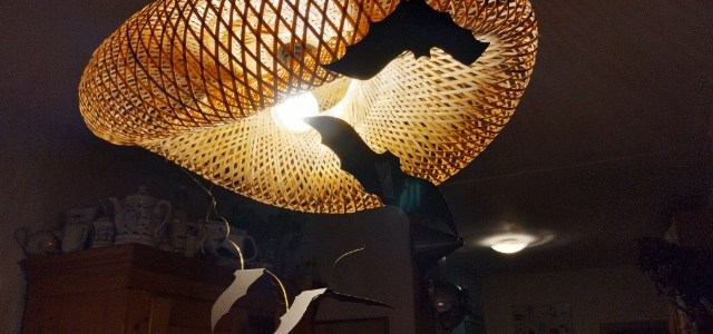Die Fledermäuse könnt Ihr per Schablone so oft vervielfältigen, wie Ihr wollt. (Ich habe ein DinA4 in der Mitte geknickt und dann nach aufgezeichnet Vorlage ausgeschnitten. selbige gibt es auch genug im Netz.) Ob Ihr sie nun an Äste klebt oder mit Klebeband an Drähte, die um die Lampe gesteckt werden oder wie eine Girlande aufgehängt werden. Ein heller Lampenschirm, ein paar Flattermäuse von innen und/oder außerhalb sieht auch dezent gruselig aus. Vieles kann damit bestückt werden…