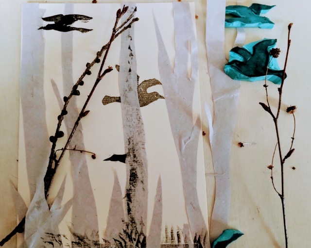 Ein Winterwald sieht oft Grau, Schwarz und Weiß aus. Mit Stempeln, dünnem grauen Einpackpapier und zwei, drei Ästchen hab ich versucht ein wenig dreidimensional zu werden.