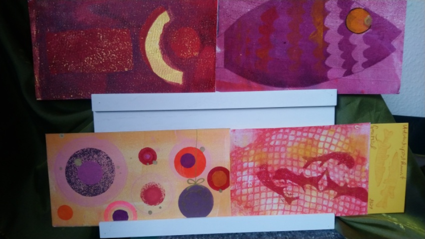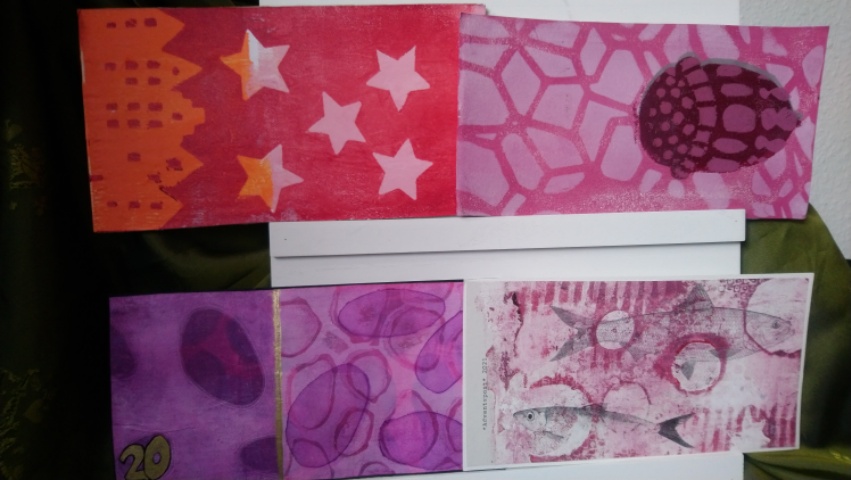 Ich gestehe, dieses Projekt empfand ich als sehr aufwendig. Vielleicht hatte ich mir die Ziele, die Erwartungen zu hoch gesteckt, dazu kamen 4 Wochen die ich nicht nutzen konnte, plus einer Urlaubswoche. Der Sonnendruck, so wie ich es mir (mit Stoffstücken, die ich mir zur Weiterverarbeitung vorstellen konnte) gedacht hatte und mit meinen Möglichkeiten (ohne noch mehr kaufen zu müssen an Wannen, Farben, etc.) hat sicher Ausbaupotential. Insgesamt bin ich froh, dass ich wieder etwas gelernt habe. Ganz zum Schluss bekam ich ein paar schöne Motive doch noch hin, da war aber schon gebündelt. Die gehen als Karten so an Bloggerfreundinnen die Tage raus.