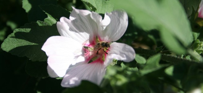 Jeden Morgen gehen neue Hibiskus-Blüten auf und werden reichlich von Hummeln und Bienen besucht. Das Insekt ist vor lauter Pollen kaum zu erkennen.