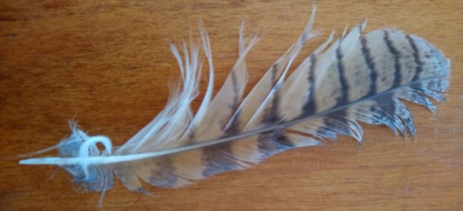 Etwas größer als der Bussard, braun durchgefärbt und mit einem helleren „Band“ hinten am Übergang zum Schwanz.
