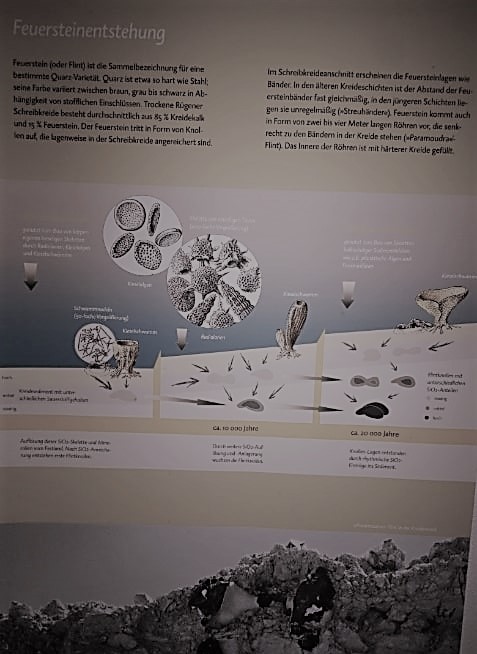 Die Zeit, in der die Kreide und die Feuersteine entstanden, ist erdgeschichtlich gesehen, der jüngste Abschnitt des Erdmittelalters. Der große Superkontinent Pangäa war erst kurz zuvor, etwa vor 150 Millionen Jahren, auseinandergebrochen. Dort, wo heute Rügen liegt, erstreckte sich ein flaches Schelfmeer, das im Norden von Schweden und im Süden durch die Alpen, welche sich gerade erst aufgefaltet hatten, begrenzt wurde. Einzellige Kalkalgen von ca. 0,01 mm Größe gab es in diesem Meer in großen Mengen, welche Skelette aus Kalk bildeten. Übrigens gibt es solche Algen auch heute noch in den Meeren. Zusammen mit anderen Krebstieren und Wirbeltieren sanken diese Algen nach dem Tode zu Boden und bildeten Schichten von Kalkschlamm. Sie verdichteten sich durch Überlagerungen zu dem aus fast reinem Kalziumkarbonat bestehenden Gestein. Und so entstanden vor 70 Millonen Jahren dieses kleinen Wunder.
