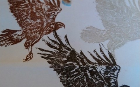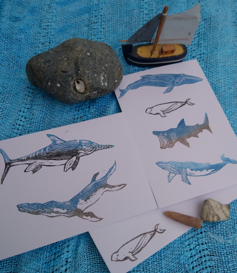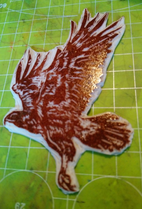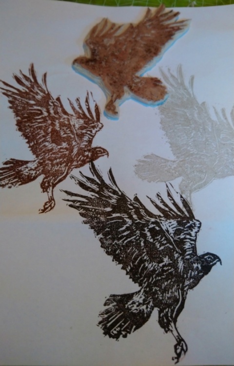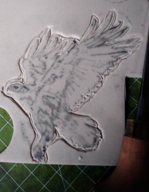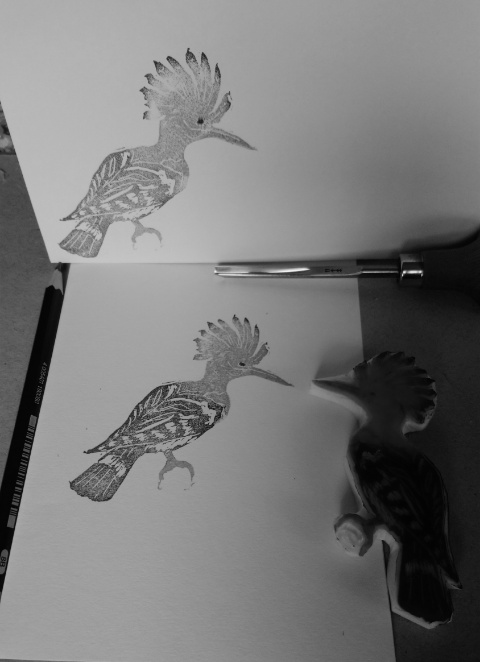 Den Stempel habe ich nach einem Foto, welches ich im Netz gefunden habe, gemalt und geschnitzt. Ich hoffe, man erkennt ein wenig den Werdegang. Um die Feinheiten hin zu bekommen, habe ich Softcut genutzt, so kommt das Federkleid gut zur Geltung und selbst so ein spitzer Schnabel kann geschnitzt werden. (selbstgekauft, kein Werbeauftrag)