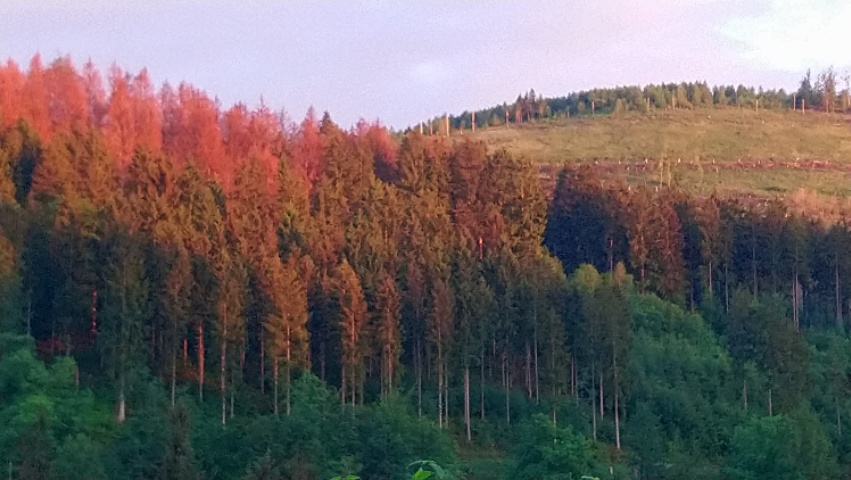 Eigentlich sind diese Fichten noch zu jung für Borkenkäfer, da die Borke dünner ist, aber wie sagte meine Mutter, „wer Hunger hat“… Sehr Ihr die starken Harz Austritte? Daran erkennt man den Befall.