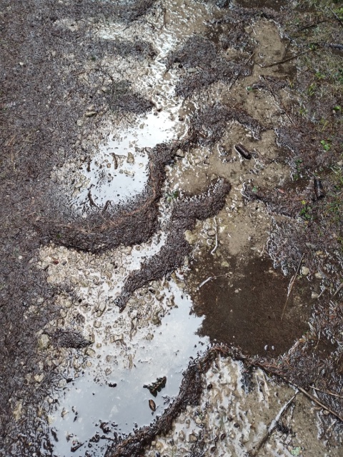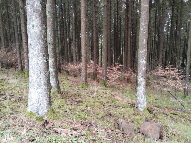 Sehr Ihr hier die längliche Senke? Die Berge an Lenne- und Hundemtal sind steil. Landwirtschaft ist kaum möglich. Aber natürlich gab und gibt es Holzwirtschaft, allerdings früher noch mit Rückepferden. Um gefällte Bäume besser gen Tal zu bringen, gab es diese Schlepprinnen. Gutmütige und kräftige Kaltblüter waren hier im Einsatz. Das ist schon lange her, aber diese Vertiefungen sind geblieben, trotz Bewuchs.