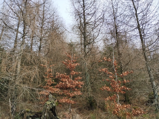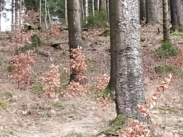 Hier wurden kanadische Eichen angepflanzt. Viele wurden leider von Rehen verbissen, wie eine Kontrolle zeigte. Neuer Schutz muss wieder angebracht werden.