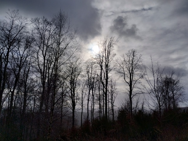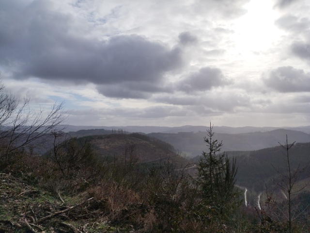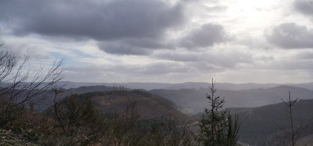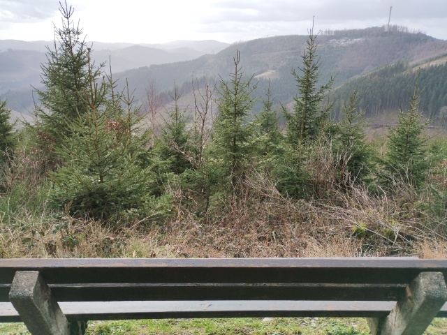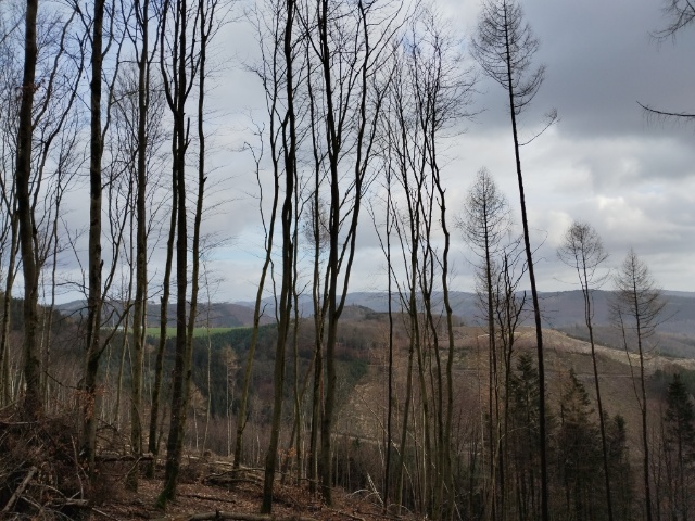 Blick auf die Altenhundemer Klippen, da wo die noch kahlen Eichen stehen. Hier hat mein Vater Indianer gespielt. Ganz neu wurden hier auf der Fläche Lärchen angepflanzt. Zu sehen sind die jungen Bäumchen wohl eher nicht 😉