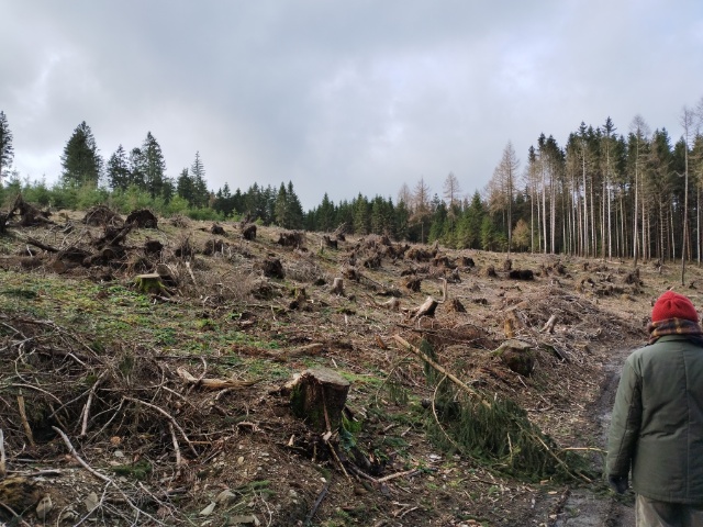 Hier ist ganz frisch gemulcht nach Fällung wg Borkenkäfern. Und Ihr seht selbst gezogene, frisch angepflanzte Speierlinge (besonders geschützt) und Nobilis.