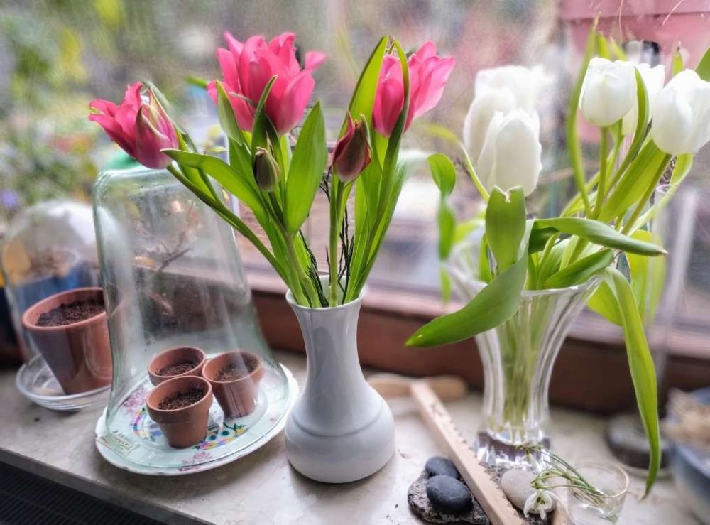 Die Woche gab es einiges zu organisieren. Und meinerseits Nerven zu behalten, was mir nicht immer gelang. Die neu geschenkte Vase gefällt sehr, eine originelle Pilzform. Und rein kamen gleich -natürlich wieder- Tulpen. Selbige wuchsen diesmal sehr wie sie wollten, wie man sieht. Deswegen mag ich auch Tulpen.