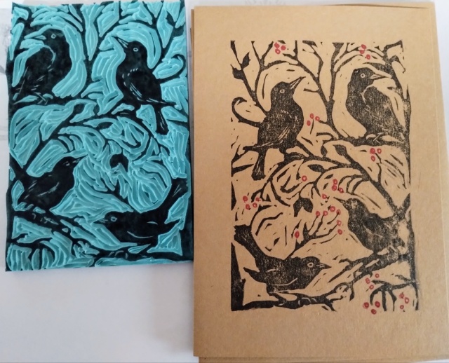 Drei kleine Vögelchen habe ich mir als Stempel geschnitzt. Schließlich sieht man sie doch immer in Gruppen. Perfekt auch als Motiv für Karten (oder auf Trockentüchern und Stoff, was ich aber noch testen muss)