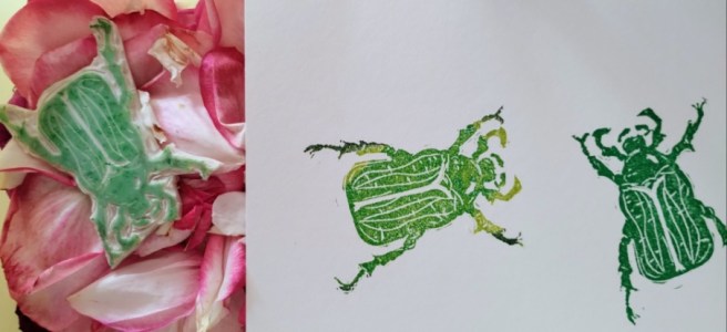 Und endlich habe ich den Rosenkäfer Stempel zu Ende geschnitzt. Der Blogbeitrag zu ihm ist ja nun schon etwas her. Aber ich hatte ein wenig Unlust bezüglich Schnitzen und auch etwas weniger Zeit. (Und in den Urlaub hätte ich das ganze Zeug nicht mitgeschleppt. Dort fand ich es schöner, zu malen.)