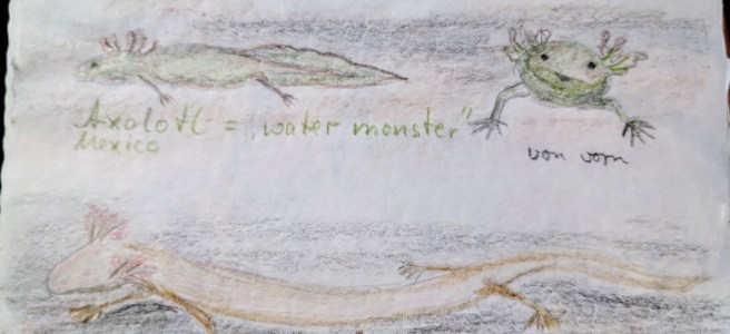 Axolotl ist aztekisch. „Atl“ steht für Wasser und „Xolotl“ ist der Name eines Aztekengottes. Er bedeutet unter anderem „Monster“.