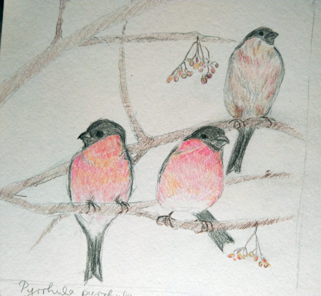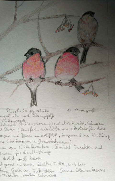 Ich zeige Euch diesmal einige von mir mit Blei- und Bundstift gemalte Gimpel und den (einfach gehaltenen) als Stempel geschnitzten Dompfaff (nicht nur für den Pullover). Übrigens kommen Gimpel auch gerne im Winter an Futterhäuschen. Vielleicht habt Ihr ja mal Glück.